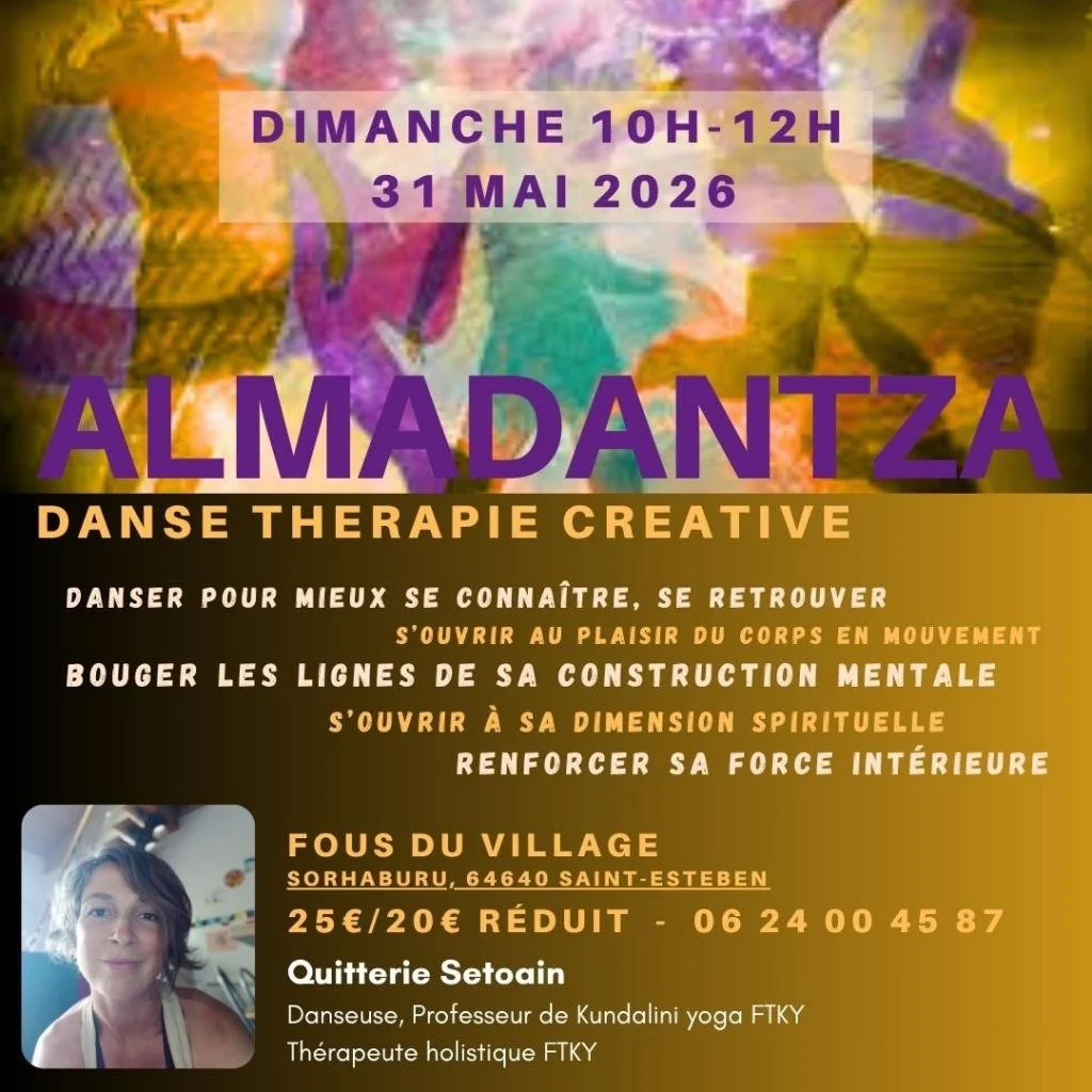 Almadantza propose un travail de reconnexion et de dialogue à soi et à ses profondeurs, au travers du mouvement libre, de la libération de l’énergie, et de la rencontre avec nos parts intérieures (émotions, états, blessures, besoins, manques, ressources, sagesse, doutes…).